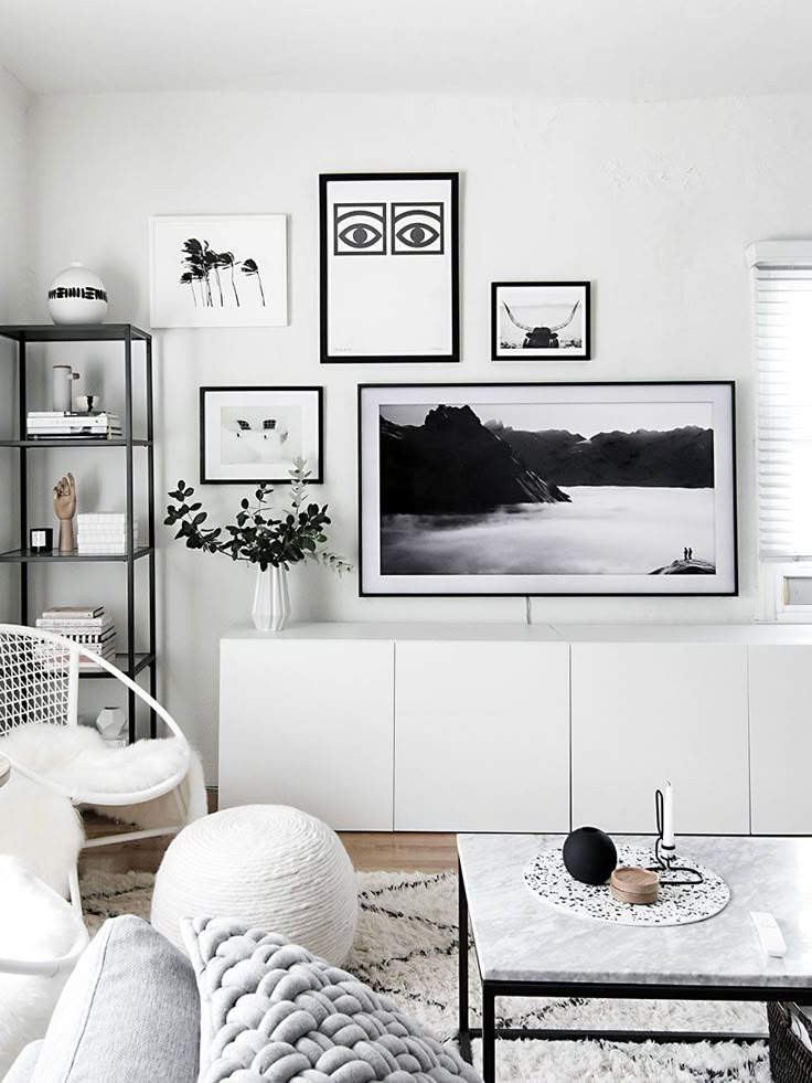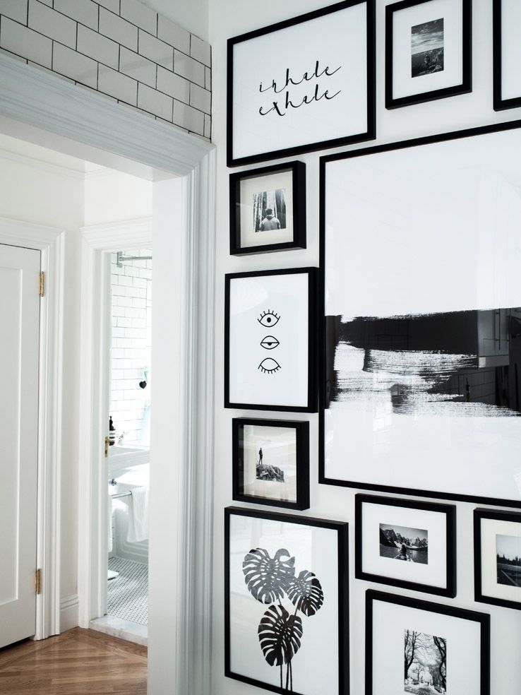 Как сделать так, чтобы белые стены в интерьере не пугали своей белизной? Просто используйте побольше декора! Создайте на стене яркую композицию из картин или постеров. Поставьте у стены открытый книжный шкаф или горшки с цветами, скульптуры и арт-объекты.