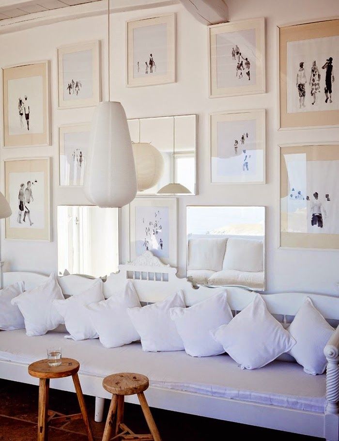 Есть множество приемов декорирования, которые позволят получить максимальную выгоду от белых внутренних стен. Они использовались в дизайне издавна. Пример тому — греческие, японские, марокканские и скандинавские интерьеры. Ощущение чистого минимализма белой стены компенсируется в них более красочной мебелью, оригинальными коврами, текстилем ручной работы и произведениями искусства. Этот контраст — секрет удачного интерьера.