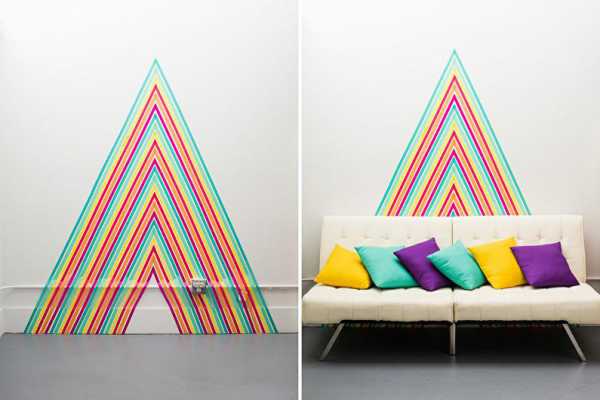 Скотчем можно не только склеивать бумагу, но и создавать эстетичные геометрические композиции в интерьере. Он намного удобнее в использовании, а вариативность цветов и узоров только расширяет возможности декора.