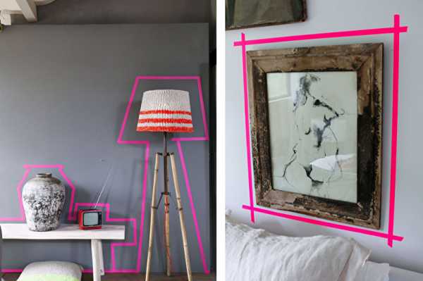 Бумажная лента подойдет скорее для современного дизайна, в котором столь необычные решения выглядят наиболее органично. При помощи скотча можно, к примеру, обвести предметы мебели, разнообразить однотонные поверхности, «написать» слова или фразы и даже осуществить зонирование.