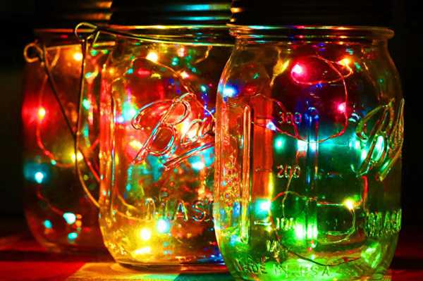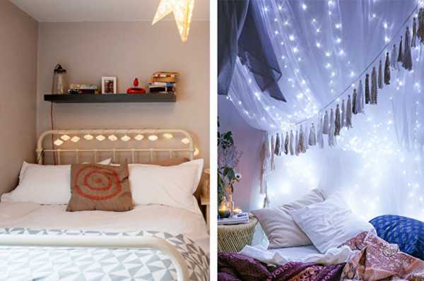 Гирлянды превращаются в своеобразный ночник, если разместить их в стеклянной емкости, вроде банки или вазы. Развесить их можно также на спинке кровати, но еще эффектней выглядят огоньки на балдахинах. Только не забывайте о безопасности и проверяйте, чтобы прилегающий материал не нагревался.