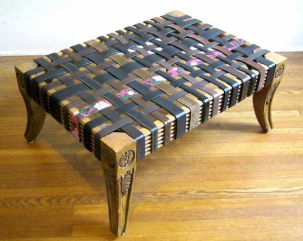 Такой предмет мебели, помимо журналов о садоводстве или стройке, состоит из деревянного основания (которое можно изготовить самому из столярного щита), подушки и двух старых ремней, стягивающих всю конструкцию.