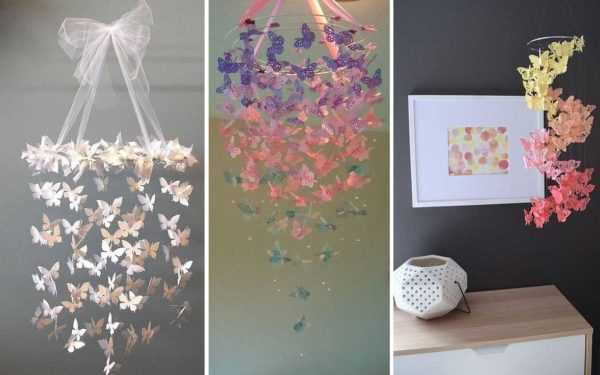 Используют бумажные бабочки для создания объемных декоративных композиций на небольших обручах с привязанной к ним леской. На леске закреплены вырезанные бумажные насекомые. Их на стену не повесишь, но смотрятся они очень оригинально, хотя создавать такую композицию сложнее, чем на стене.