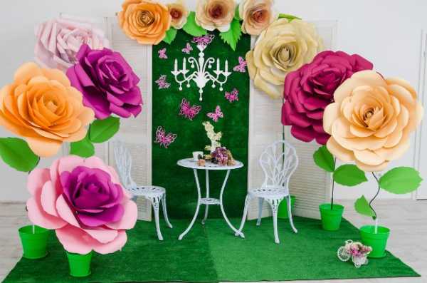 Совет! Можно изготовить цветы из бумаги для украшения зала на определенный праздник. Например, оформить гостиную на день рождения ребенка, а после завершения праздника убрать со стен.