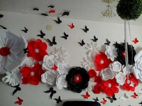 Разместить готовые украшения можно на потолке, стенах, тюле либо портьере. Оригинальный вид имеют огромные цветы, которые размещены на полу.