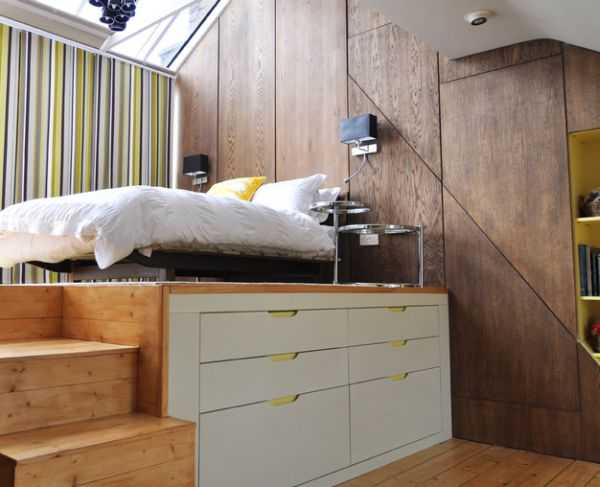 Современная кровать на возвышении идеально подходит для небольшой спальни.