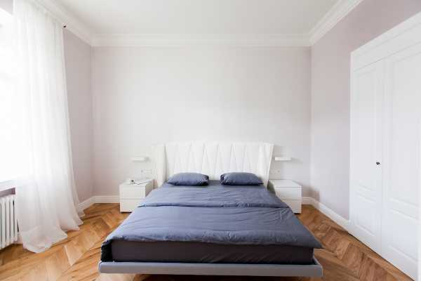 Удели внимание напольному покрытию. Паркет или ламинат для пола лучше укладывать по диагонали. Это поможет зрительно увеличить спальню.