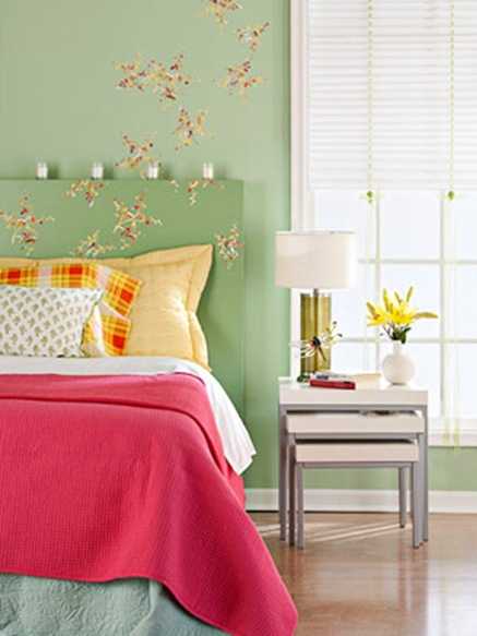 Ещё один способ декора спальни – роспись стен. Тут вам понадобятся навыки изобразительного искусства или трафареты… Техника разрисовки стен при помощи шаблона доступна всем и не требует больших затрат, а подойдёт для неё любая гладкая поверхность. Такие трафареты можно купить в магазинах обоев и декора, интернет-магазинах, а также сделать самому из лавсановой плёнки майлар. Ее кладут на стекло, сверху – рисунок, сделанный на бумаге, и вырезают лишнее канцелярским ножом. Используется трафаретная техника в основном на потолках и стенах, а ещё экспериментируют на дверях, зеркалах, мебели и межоконном пространстве. Изображение переносится по трафарету на поверхность с помощью кисти, поролоновой губки, баллончика или валика. В основном используют акриловые краски, так как у них куча преимуществ: практичность, стойкость, нетоксичность. Также применяют и акриловую пасту и декоративную мелкозернистую штукатурку. Вооружитесь фантазией, красками и желанием придать своей комнате неповторимый образ – и у вас всё получится!