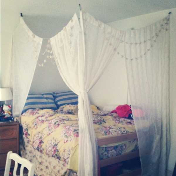 Конструкция балдахина со стойками должна быть прочно укреплена к кровати и зафиксирована.