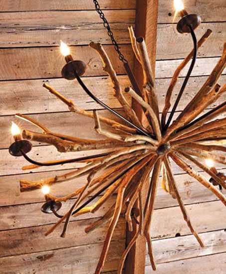 Из ветвей получаются интересные образцы деревянного декора в интерьереИз больших ветвей можно сделать балки, уместные в деревенской стилистике, рустикальном стиле и провансе.