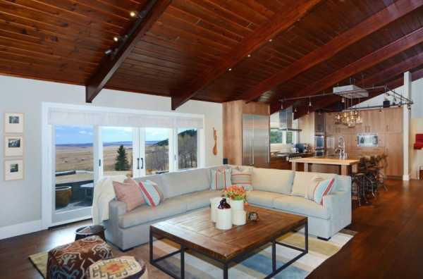 Отделка потолка также может быть выполнена с помощью натуральных материалов. Квартиры, оформленные в таком стиле, всегда привлекают внимание окружающих. Сочетание белых стен и потолка, а также коричневых или черных балок помогают создать интерьер в колониальном стиле.