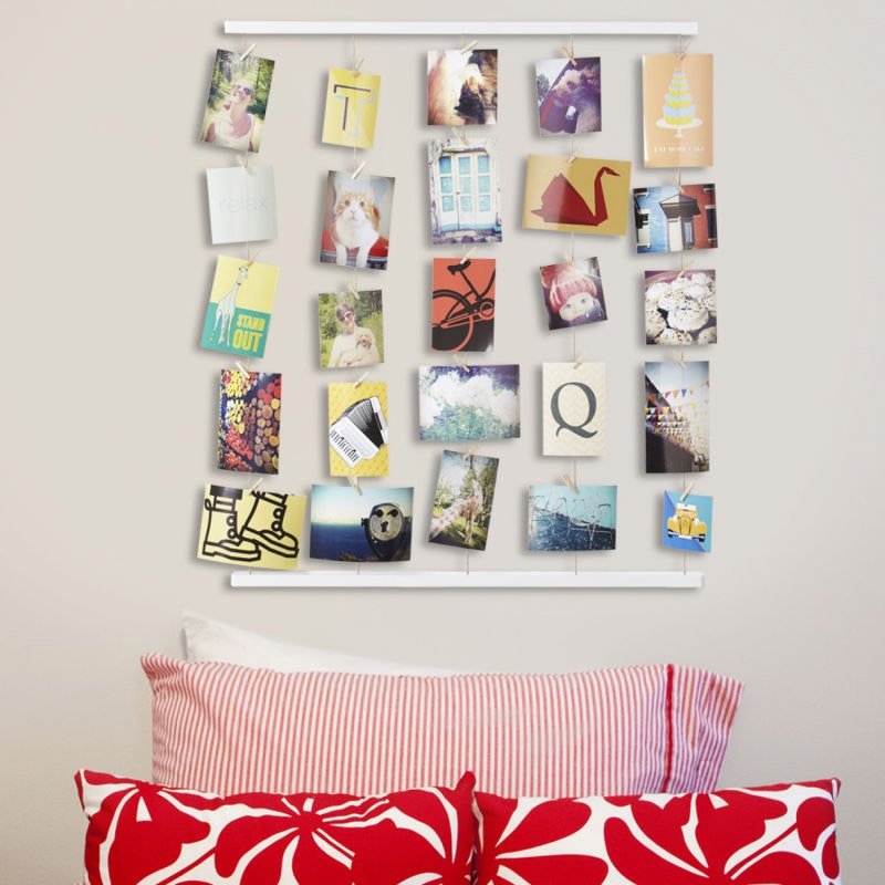 - В-пятых, способ крепления. Фото можно подвесить на ленточках или соединить между собой декоративным шнуром в определенном порядке. Креативный вариант — подвесить фото на прищепках по натянутой вдоль стены проволоке или веревке.