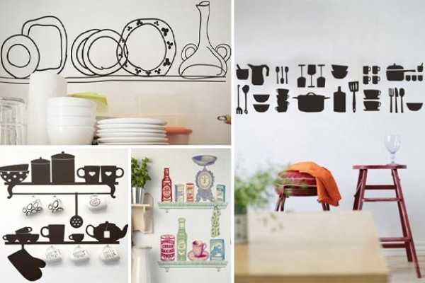 Живопись — не единственный способ украшения стен на кухне. Излюбленным приемом многих дизайнеров является оформление стен, путем наклеивания на неё различных предметов тарелок, вилок, ложек и тд.