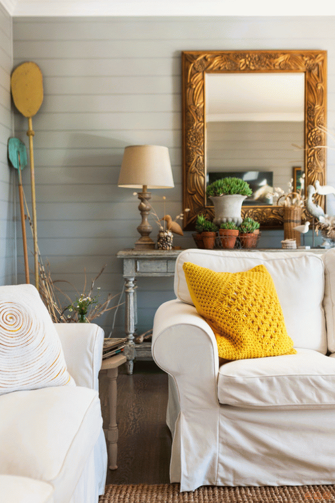 Для этого стиля интерьера вы не найдете разбросанных повсюду якорей и ракушек. Вместо этого вы найдете вазы из синего стекла, полосатые обои или абстрактные картины, которые передают ощущение побережья. Когда дело доходит до выбора мебели в прибрежных интерьерах, они создают ощущение уюта. Раскрашенная и потрепанная мебель в сочетании с плетеной или джутовой тканью — идеальный союз для небес. Поскольку связь с природой так важна в прибрежном стиле дизайна интерьера, добавление комнатных растений просто необходимо.
