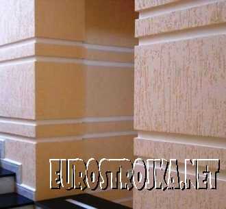 Диапазон использования штукатурки короеда широк, так как ей можно облагородить как фасады зданий, так и внутренний интерьер помещения.