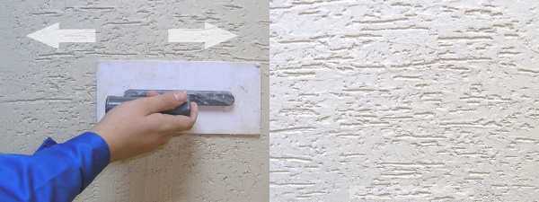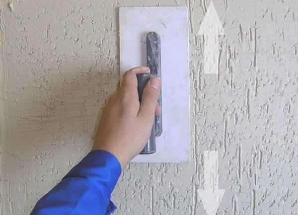 Узор формируют через 10-20 минут после оштукатуривания. Это делается пластмассовой затирочной доской, с легким прижимом и движениями плоскости в одном направлении. Текстуру формируют площадями 1-1,5 метра, не более. Стыки при затирании дополнительно взбрызгивают водой.