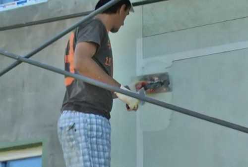 Одну стену здания необходимо успеть отделать за один приём. Это необходимо для того, чтобы каждый новый участок стыковался с ещё свежей полосой. Так на поверхности не будет стыков, и стена будет выглядеть монолитно.
