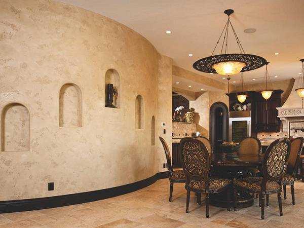 Вариантов, где отделка декоративной штукатуркой приемлема, не очень много: стены, потолок, выступы, ниши, арки.