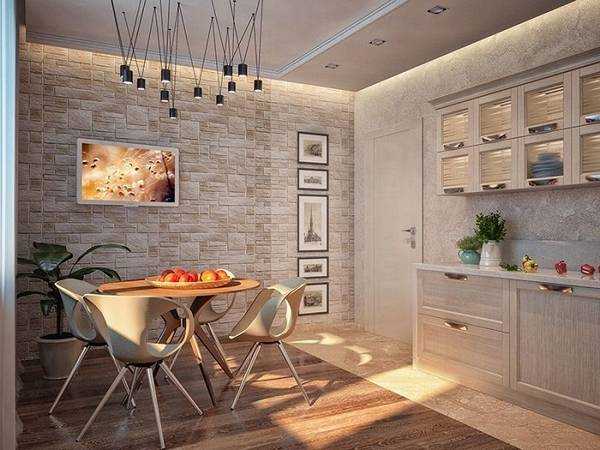 Комбинируя различные фактуры, можно разделить с их помощью кухню на рабочую и обеденную зону или добиться специальных эффектов, обработав разными типами стены, колонны или арки.