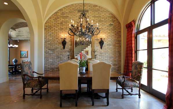 Помимо стен, кирпичом отделывают колонны и полуколонны, стрельчатые арки. Такая отделка подходит для любых комнат, от кухни до спальни. В высоких помещениях (столовой или кухне) можно облицевать кирпичной плиткой сводчатый потолок. Это создаст иллюзию старинного винного погреба. Кстати, в стенах легко устроить ячейки для хранения бутылок.