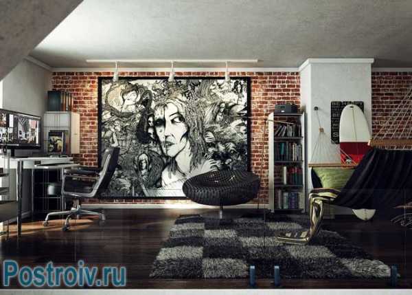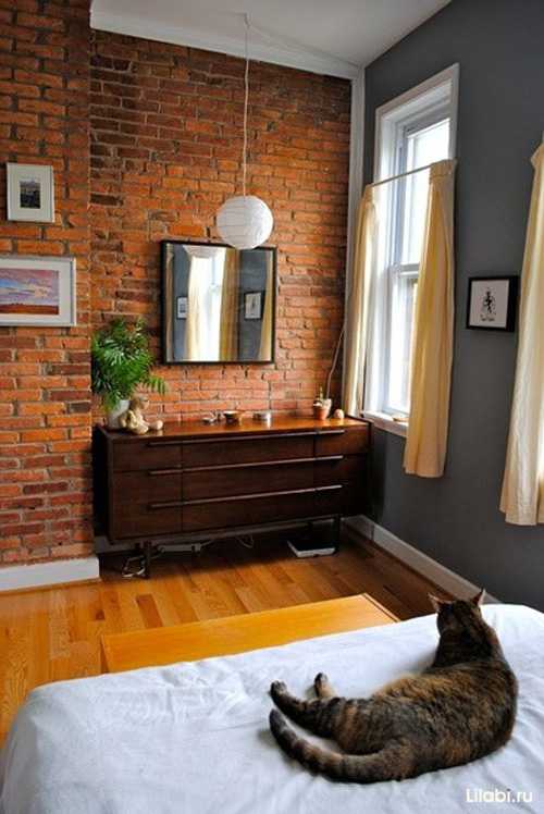 Кардинальное решение – выложить одну из стен кирпичом вместо покраски или оклейки обоями. Таким образом, придается некая загадочность, свежесть помещению, создается атмосфера живости и индивидуальности, а интерьер придает комнате обжитости и состаренности.