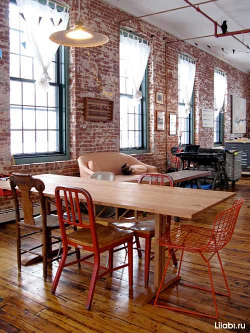 Кроме декоративной кирпичной кладки дух промышленной эстетики поддерживают старые потолочные балки, незанавешенные окна, деревянный пол. Особое место в декоре занимают картины. Их можно просто ставить на пол, прислонив к стене, или вешать обычным способом. Чем современнее содержание картин (абстракционизм, импрессионизм и поп-арт приветствуются), тем лучше выглядит их союз с архаичным кирпичом.