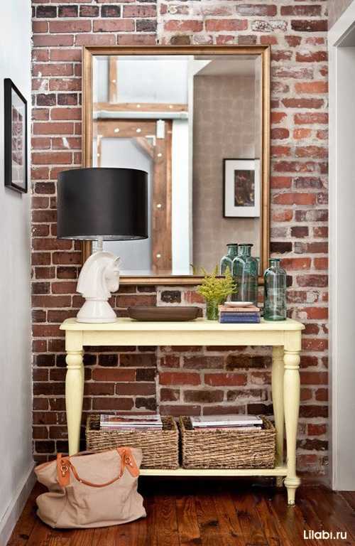 Кирпич в интерьере плохо поддается выкладке в прихожей из-за неровностей стен, небольшой площади, наличия кладовок. Единственное, если вы живете в старом домике, можете выложить одну из стен кирпичом. Такое редкое оформление привносит в прихожую нестандартный «уличный» акцент.