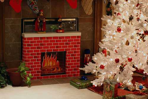 - Отделка. Представляя рождественские праздники, в голову сразу же приходят мысли о настоящем кирпичном камине. Сделать декоративный камин «под кирпич» можно несколькими способами. Первый — оклеить его обоями с соответствующим фактурным рисунком. Второй — вырезать из пенопласта или картона прямоугольники и наклеить их на поверхность камина в виде кирпичной кладки. Фигуры должны напоминать «кирпичики». Корпус камина грунтуют для того, чтобы конструкция была выполнена в едином цвете. Далее ее покрывают коричневой краской. Пространство между «кирпичиками» можно оставить белым или окрасить в желтый/золотой цвет.
