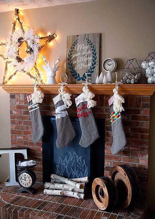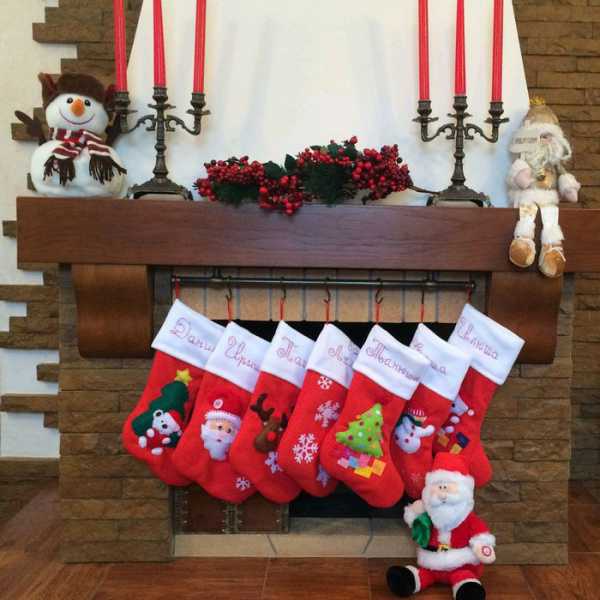 Очень симпатично и нарядно выглядит камин с висящими на нем длинными красными вязаными носками с вышитыми именами.