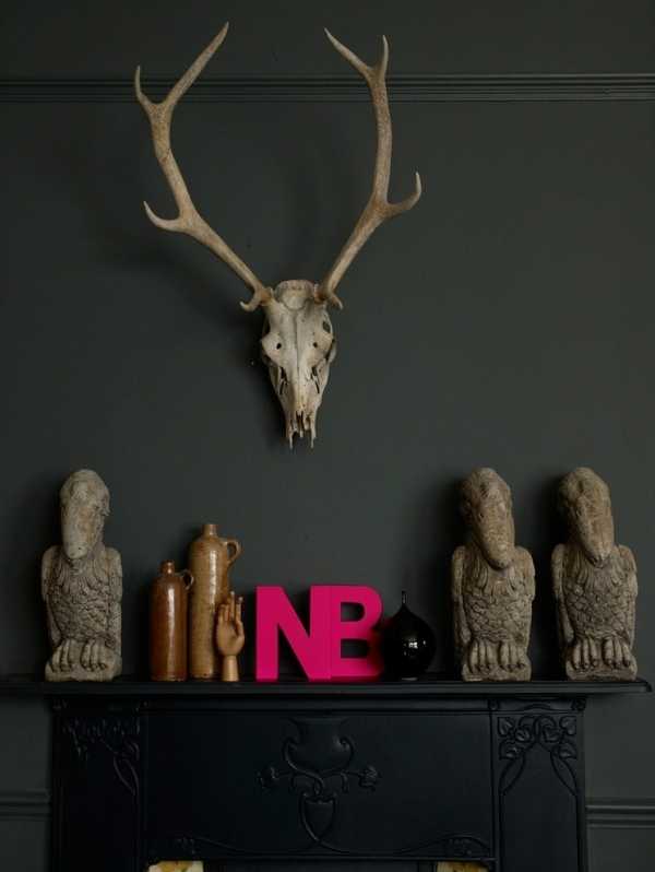 Разнообразные декоративные мелочи на каминной полке могут выглядеть довольно неуместно и незначительно. Как это исправить? Используйте массивные, крупные предметы, которые, безо всякого сомнения, будут выглядеть более эффектно. На этом снимке смесь деталей в стиле готики и поп-арта придает каминной полке действительно оригинальный вид. Ярко-розовые буквы представляют собой исключительно привлекательный акцент на сером фоне и не позволяют черепу и статуям выглядеть слишком мрачно.
