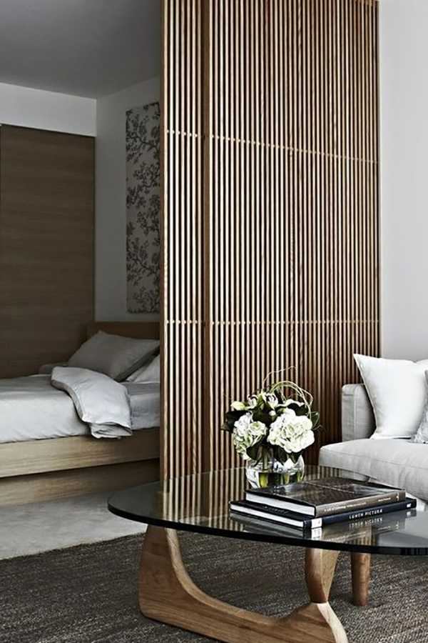Деревянная перегородка – интересное и функциональное решение, которое поможет не только зонировать пространство, но и разместить на полочках множество вещей и предметов декора.
