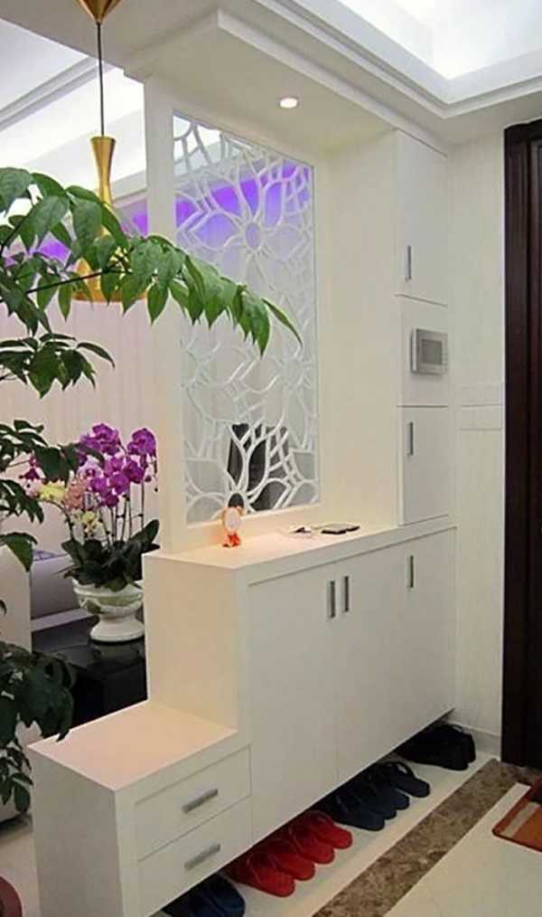 Узкая резная перегородка из пластика отделяет гостиную от коридора и служит очаровательным украшением для обоих пространств.