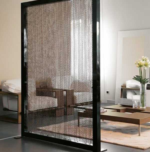 Матовая перегородка, пропускающая свет и разделяющая пространствоПрозрачные перегородки ставятся для отгорожения зоны, в которой не остается собственного источника света, но прозрачная преграда вряд ли поможет отграничению личного пространства. Гораздо больше подойдет ажурная, одновременно и пропускающая свет, и создающая ощущение изолированности.