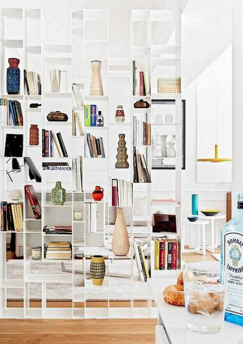 Также обрати внимание на перегородки-стеллажи. Они отлично подходят для самых разных комнат. Особенно актуален такой вариант, когда испытываешь недостаток в системах хранения.