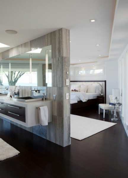 В современных пространствах открытой планировки не обойтись без перегородок. Они позволяют быстро разделить помещение на зоны, перекроить его на свой лад. Для таких перегородок часто используется гипсокартон. В этом проекте из него сделаны раздвижные перегородки, обозначающие границы ванной и спальни.