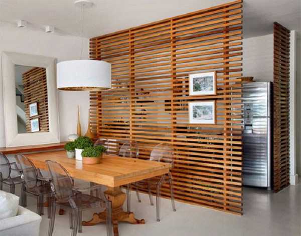 Деревянная перегородка способна вписаться практически в любой современный интерьер, став в нем своеобразным акцентом.
