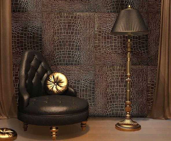 Кожа одинаково хорошо идет на отделку мебели и на декоративные панели для стен. Фото ниже демонстрирует отделку стены в виде плиток с нанесенными рисунками. Из них могут выкладываться отдельные участки также на полу.