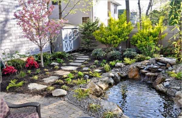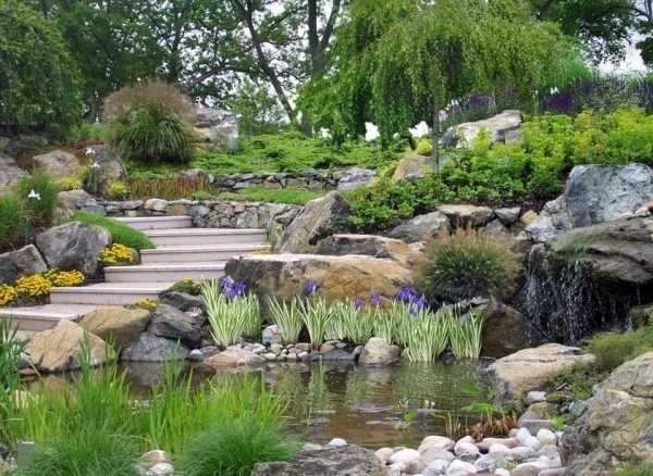 Пруд вместе с альпийской горкой — отличное сочетаниеОпределяемся с формой и стилем