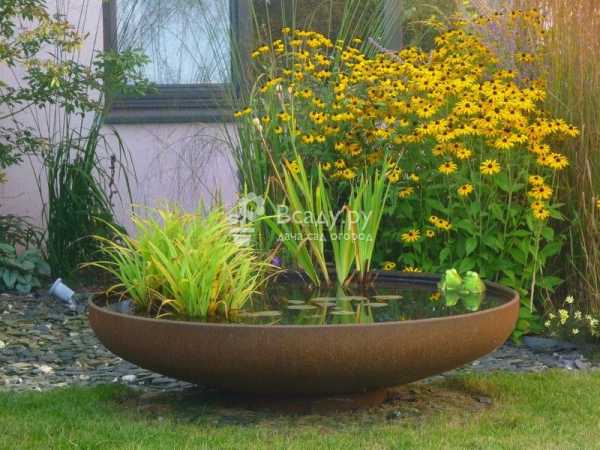 Это самый простой и быстрый способ сделать искусственный водоем на даче. В магазинах продаются чаши разных форм, размеров и цветов (в основном — голубые, зеленые и черные).