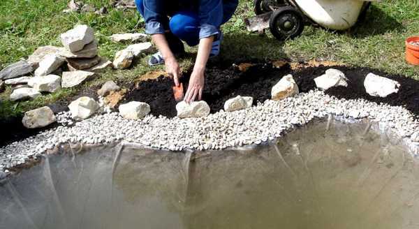 Края пленки, выступающие за борта, раскладывают и присыпают грунтом, чтобы они не заворачивались и не двигались. В соответствии с дизайн-проектом, на них можно уложить камни, или построить на краю пруда альпийскую горку, или расставить горшки с надводными растениями.