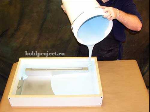 Затем нужно сделать бортики. Используя для изготовления куски фанеры или дощечки высотой 15 см, их устанавливают по контуру, скрепляют между собой саморезами или струбцинами, закрепляют к основанию. Места стыков промазывают шпаклевкой и герметиком. Подготовленную форму заливают смесью силикона или полиуретана.