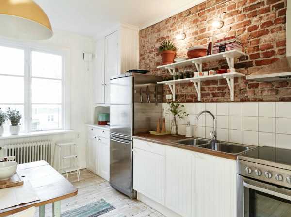 В отличие от лофта, здесь кирпич на кухне выглядит менее грубым, не таким промышленным. С одной стороны – натуральность, с другой – простота и аккуратность. Стена в скандинавском стиле не будет такой акцентирующей и активной.