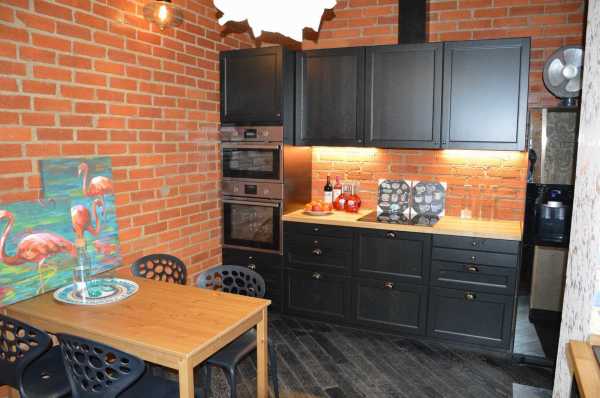 Проект кухни с кирпичной стеной- В третьих, такой материал не отражает свет. А темные оттенки визуально даже поглощают его.