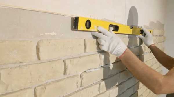 Укладка декоративного кирпича производится по разметке на стене. Начинать следует с противоположных углов снизу стены. Крепить надо с учетом промежутков в несколько миллиметров на швы.