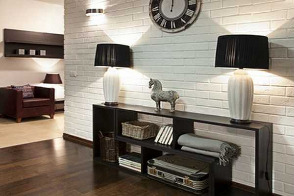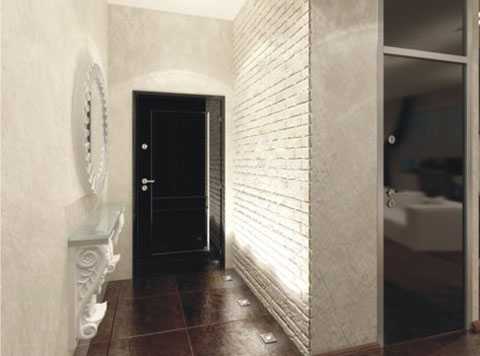 В коридорах и прихожей кирпич обычно используют для отделки проемов и мест, которые наиболее подвержены загрязнению. Учитывая, что освещение этих помещений обычно недостаточное, здесь отдают предпочтение светлым оттенкам: белый кирпич или темный, но со светлой затиркой. При выборе цвета учитывают размеры помещения, высоту потолков. Для больших помещений можно использовать оттенки красного, а для маленьких лучше подойдет белый цвет.
