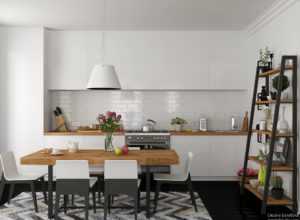 Еще очень красиво смотрится стена полностью отделанная кирпичом. Три стены в комнате можно оклеить обоями или покрасить краской бежевого оттенка. А оставшуюся стену оформить декоративным кирпичом светлого оттенка с неровными краями. Неоднородная фактура придает материалу эффект старины и свою историю. В сочетании с обеденным столом и мебельными фасадами темного цвета создается гармоничный интерьер.