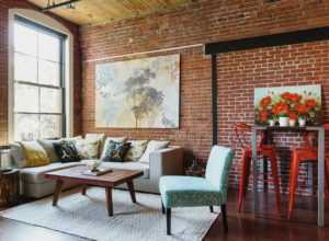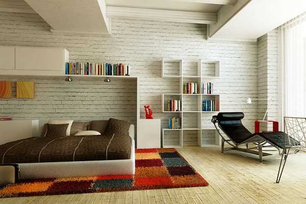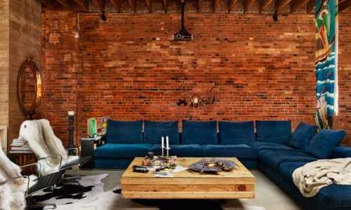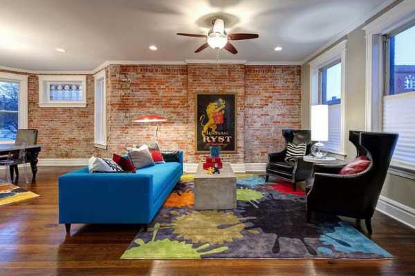 Поп-арт. Данный стиль предполагает наличие ярких красок как в обивке мебели, так и в постерах на стенах. Стены можно отделать немного прибеленным кирпичом и сочетать его с ярко-синим диваном и ковром пестрой расцветки. Такой интерьер будет очень смелым и говорить об эмоциональности и открытости к экспериментам своего владельца.