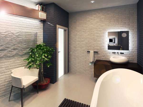 Кирпич в ванной следует обработать специальным раствором. Можно использовать плитку имитирующую кирпичную кладку.