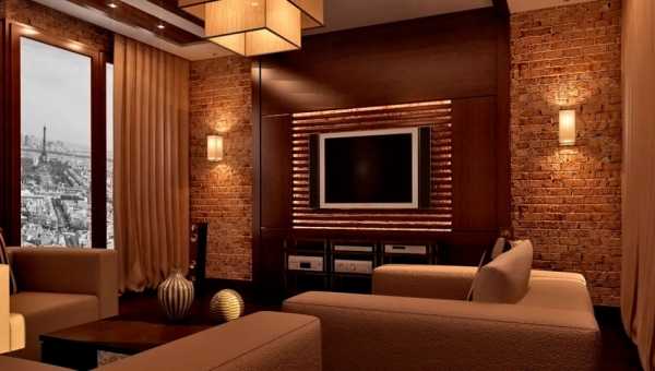 Поэтому хочется чтобы пространство оставалось не загруженным и уютным. В современном дизайне гостиных активно применяют декоративный кирпич. Казалось бы грубый материал, который придаст более агрессивный вид помещению, но это мнение ошибочно. Например, как в данном интерьере.Стены комнаты выложены клинкерным кирпичом с неравномерной окраской от красного к черному цвету. Это создает впечатление материала с историей. На одной из стен нашиты деревянные щиты глубокого коричневого цвета. По центру данного прямоугольника размещен телевизор. Освещение в комнате мягкое. В качестве источников света используется как люстра геометрической формы, так и настенные светильники, расположенные симметрично. Мягкие кресла и диван светлого цвета и шторы им в тон дополняют общую картину. В целом комната выглядит современно и уютно.