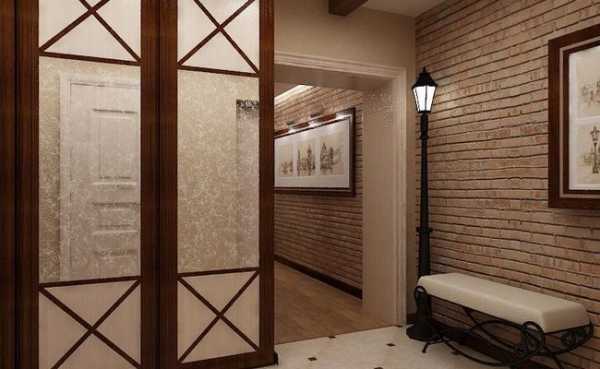 Так как кирпич декоративный является очень практичным материалом, то для отделки данного помещения вполне годится. Не обязательно оформлять им все стены целиком, достаточно выделить одну, которая меньше всего будет загружена мебелью. Вся стена выкладывается материалом под цвет старого, выгоревшего кирпича. Очень красиво будет если на поверхности будут неровности. Такой кирпич отлично сочетается с бежевой напольной плиткой. Интерьер можно дополнить шкафом с зеркальными дверцами, пуфиком с кованными ножками и оригинальным светильником, в виде уличного фонаря. Такая прихожая понравится вашим гостям и погрузит их в атмосферу старой Европы.